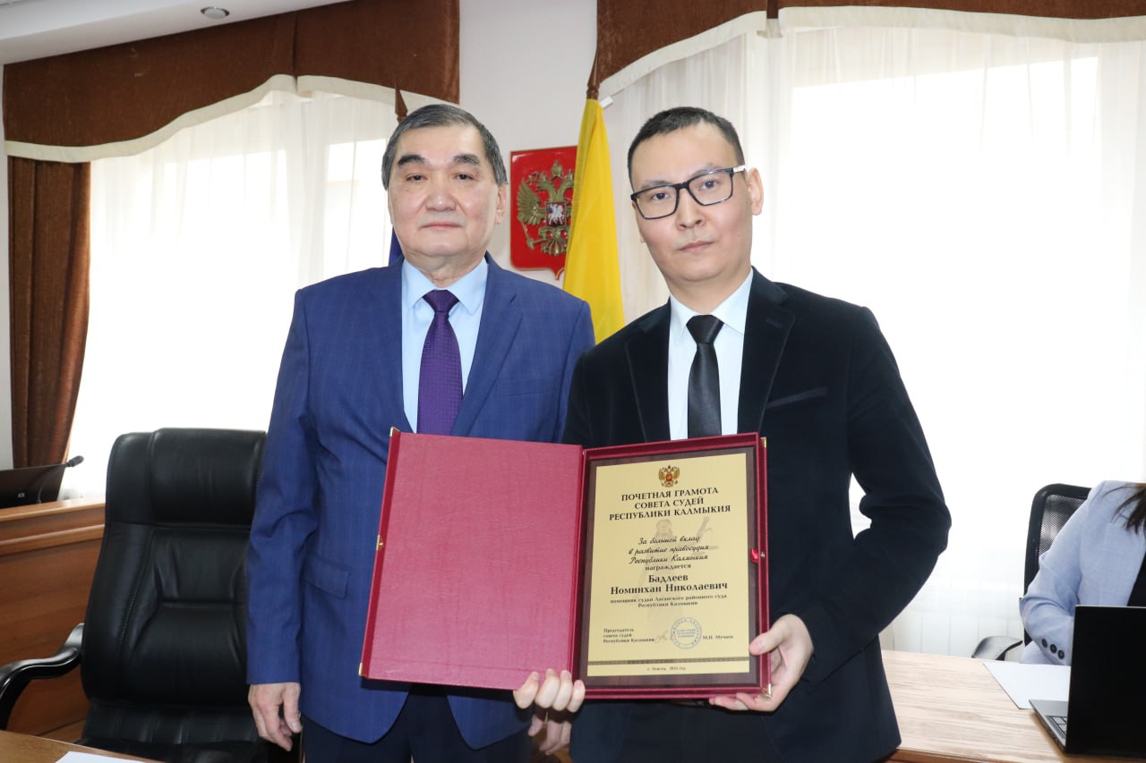 20 февраля 2026 года состоялось заседание совета судей Республики Калмыкия, в ходе которого почетной грамотой совета судей Республики Калмыкия был награжден помощник судьи Лаганского районного суда Бадлеев Номинхан Николаевич, показавший хорошие знания и высокие результаты в выполнении заданий ежегодного конкурса «Лучший помощник судьи Республики Калмыкия». Коллектив суда поздравляет Бадлеева Н.Н. с получением заслуженной награды и желает дальнейших успехов в работе и достижения новых высот. Пресс-группа Лаганского районного суда РК |